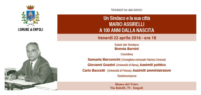 Sarà presente il sindaco di Empoli Brenda Barnini, coordina la consigliera comunale Samuela Marconcini. Interverrano due studiosi: Giovanni Gozzini (Università di Siena): Assirelli politico; Carlo Baccetti (Università di Firenze) Assirelli amministratore. Sono anche previste le testimonianze di coloro che saranno presenti.